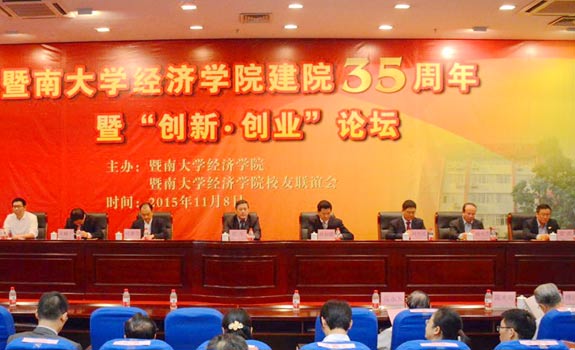 卅五年沧桑砥砺,薪火相连;卅五载栽桃培李,春华秋实。11月8日上午,由经济学院与经济学院校友联谊会共同主办的“暨南大学经济学院建院35周年暨‘创新·创业’论坛”在曾宪梓科学馆国际会议厅举行。领导胡军、林如鹏、宋献中,校董叶惠全,经济学院院长刘少波以及学校各部处、兄弟学院负责人,经济学院校友联谊会成员、各届校友、学院师生共计400余人出席了论坛。论坛开幕式由经济学院党委书记张志主持。