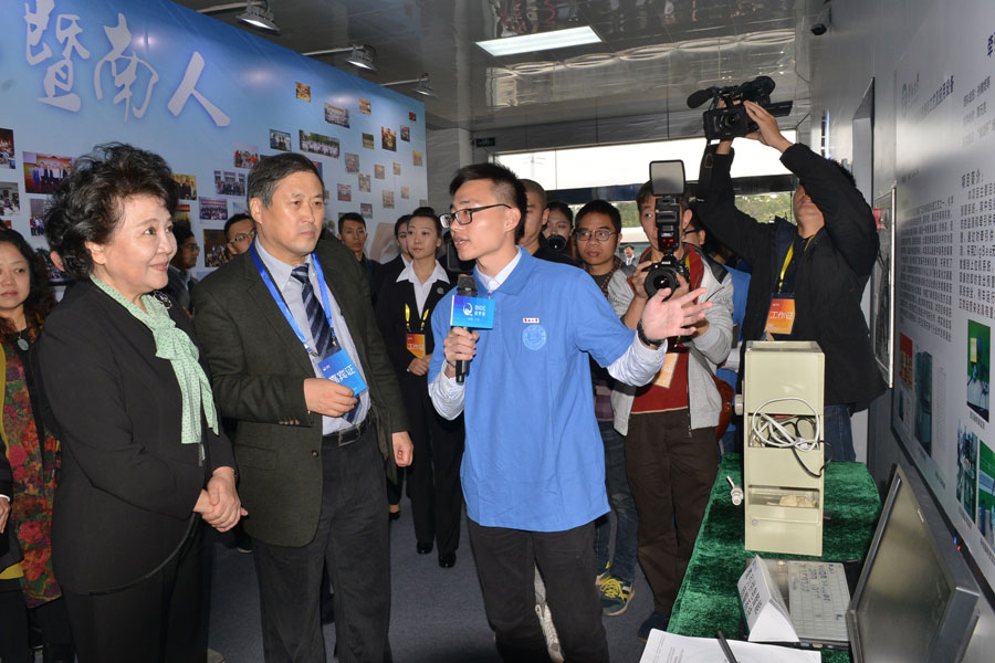 在“侨梦苑”创新中心举办了创新创业成果展,充分展示了学校高层次创新人才队伍、重点创新平台,在高端电子、资源环境、高端装备、创新药物、食品和包装工程、医疗器械等领域取得的一批科技创新成果;同时还展示了在海外学生培养和大学生创新创业驿站建设成果及校友资源情况等。裘援平和陈建华在展厅听取了具体项目介绍和相关工作汇报,并对取得的成绩表示了肯定。