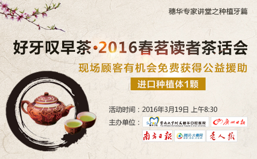 2016年3月19日上午8:30,广州日报2016春茗读者茶话会将邀请穗华口腔医院院长赖仁发资深种植科专家张春雷主任为广大读者解疑释惑,还有已做种植牙的患者现场为大家分享交流种植牙的使用效果及种牙过程的心得体会。