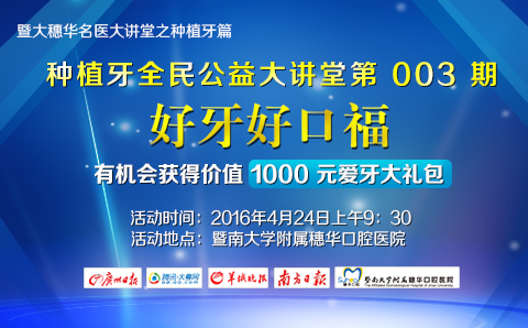 2016年4月24日上午9:30,种植牙全民公益系列讲堂第003期将邀请穗华口腔医院资深种植科专家贺文鹏主任、张春雷主任现场为读者揭开种植牙的奥秘,解析种植牙手术案例以及手术全程细节。