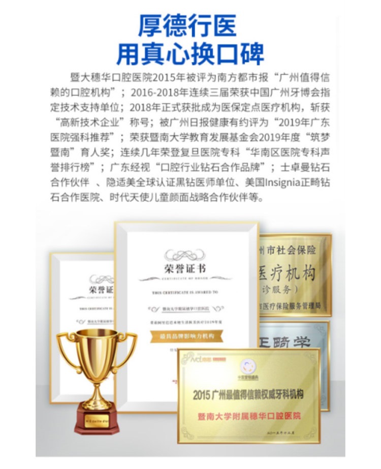 穗华口腔医院正畸科由拥有数十年正畸临床经验的孔卫东院长、肖世芳副院长领衔的硕博正畸团队组成,精研数字化舌侧、数字化隐形、数字化固定等矫治技术,拥有eBrace舌侧矫正专利技术。科室引进国际领先的人工智能数字化正畸检查系统,运用3D数字化诊查设备、AI数字化根骨监控系统,实现正畸诊疗一站式数字化操作,满足个性化、复杂化、高难度的正畸需求。