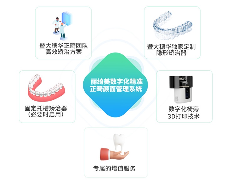 丽绮美数字化精准正畸颜面管理系统是穗华口腔医院基于丰富的正畸临床经验独家推出的数字化颜面管理系统。该系统由穗华口腔医院硕博正畸团队的个性化矫治方案、与中美联合团队共同研发的隐形矫治器、先进的椅旁 3D 打印技术以及在必要阶段介入的固定托槽矫治技术組成。它是针对各类错合畸形的一套综合治疗系统,这是它和其他隐形矫治的大区别,不只单单提供矫治器。它能使矫治过程更高效、舒适,且每一步都能精准把控。