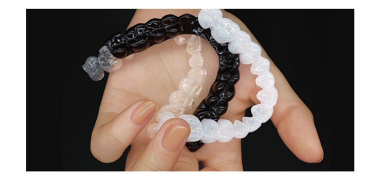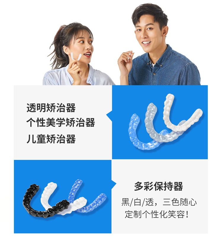 丽绮美-多彩全效保持器根据生物材料学、力学、美学等创新,使矫治患者强化巩固治疗的同时兼顾美观,独家定制透明、美白、黑色三款交替使用。